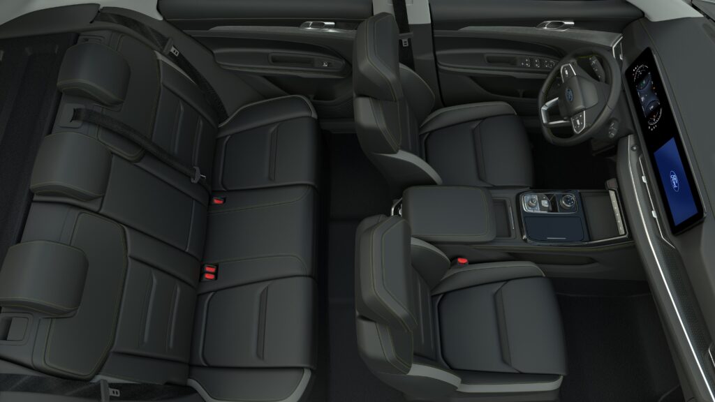 El interior de la Ford Territory Híbrida ha sido diseñado para ofrecer una experiencia premium. Con una de las cabinas más amplias del segmento, su segunda fila destaca por el generoso espacio para las piernas (956 mm) y la cabeza (997 mm). Los asientos, tapizados en cuero bicolor, ofrecen ajuste eléctrico, ventilación y calefacción, lo que eleva el confort incluso en trayectos largos.